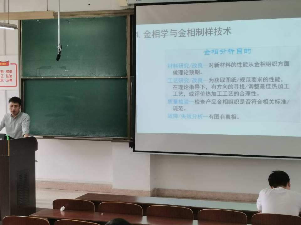 讲座伊始,张秋阳老师向我们介绍了全国老员工金相技能大赛的由来、赛徽以及在全国各大类比赛中的地位,着重强调金相大赛已经成为材料类专业规格最高、制度最健全、覆盖面最广、影响力最大的一项赛事。随后,张秋阳老师向同学们详细地讲解了有关金相学与金相制样的技术,并用实例说明了球墨铸铁在金相制样中的技巧——怎样把球磨铸铁的石墨形状腐蚀出来,什么是石墨的最佳状态。