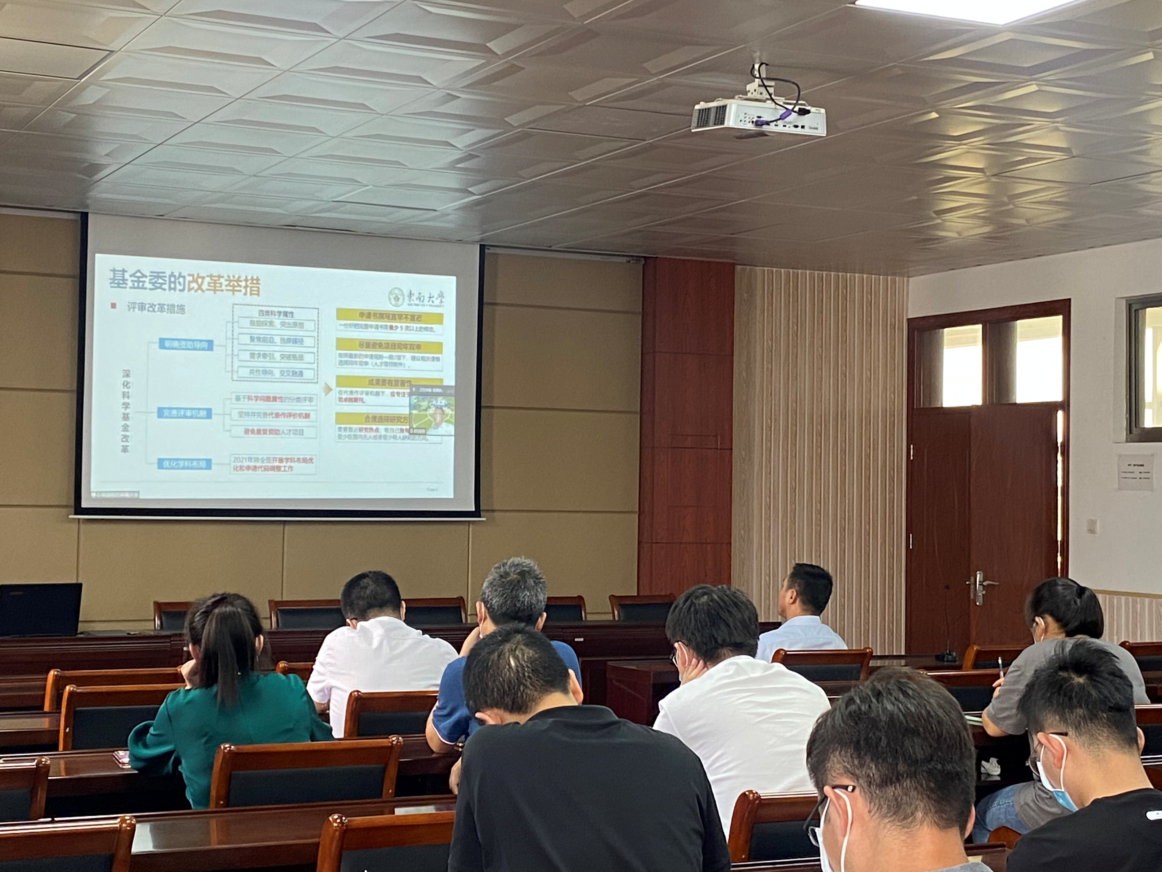 首先,殷教授从自然基金委改革举措、自然科学基金设立的初衷以及基金申请书撰写注意事项三个方面,向老师们全面、具体的介绍了国家自然科学基金。报告中,殷教授总结了申报书撰写中的“八大共性问题”并结合自己多年的科研经验为老师们进行了深入浅出的讲解,从申报书的选题、立项依据、研究内容等多个方面对项目申报进行了具体指导。与会者纷纷表示讲座内容细致全面、精彩实用,受益匪浅。