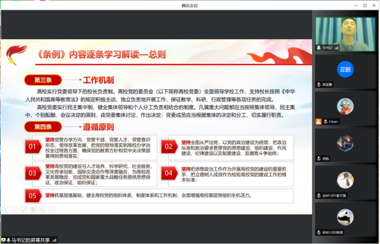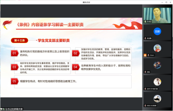 3月23日晚7:00,由公司党委书记马从兵教授主讲,党课的主题是“学习条例守准则,争做表率勇担当”,培训采用线上腾讯会议的方式进行。19、20、21级本科生、研究生共96名积极分子参加了培训。