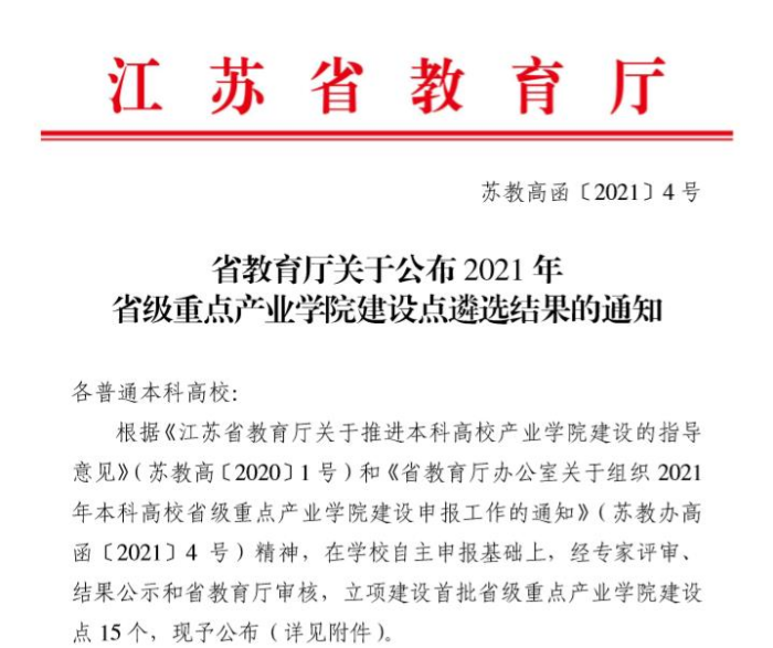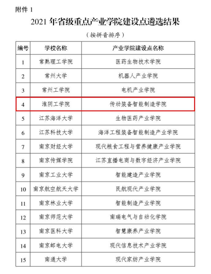 近日,江苏省教育厅发布了《省教育厅关于公布2021年省级重点产业公司建设点遴选结果的通知》,公司申报的“传动装备智能制造公司”成功获批,成为江苏省2021年度立项的15个省级重点产业公司建设点之一。