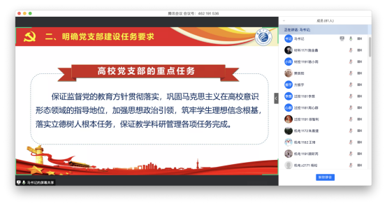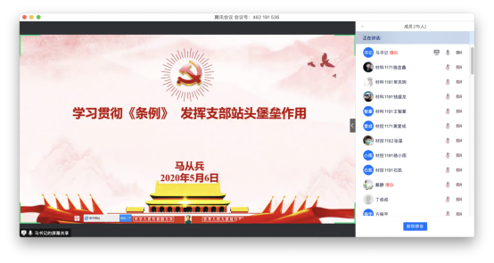 5月6日下午3:00,EVO真人视讯在腾讯会议APP开展“同心抗疫践初心,‘硬核’党员担使命”主题党课暨2020年上半年党课培训第二讲《学习贯彻条例 狠抓四项重点》。本次培训会主讲人为公司党委书记马从兵,研究生、2017级、2018级与2019级积极入党分子参加了此次党课。