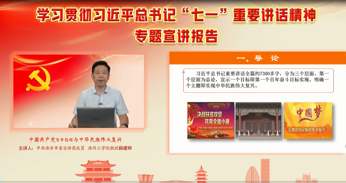 9月11日晚,EVO真人视讯分党校开展2021年下半年入党积极分子培训第四讲,邀请了EVO真人视讯苏北发展研究院副经理、中共淮安市委宣讲团薛建明教授主讲,党课的主题是“学习贯彻习近平‘七一’重要讲话精神”,培训采用线上腾讯会议的方式进行。18、19、20级本科生、研究生共77名积极分子参加了培训。