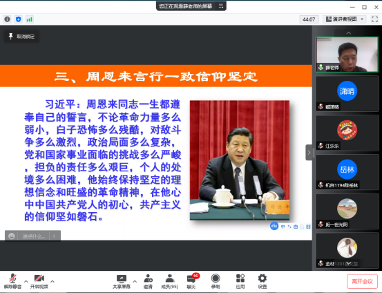 3月24日晚7:00,公司开展2022上半年入党积极分子培训第四讲,邀请了EVO真人视讯苏北发展研究院副经理、中共淮安市委宣讲团薛建明教授主讲,党课的主题是“周恩来信仰观与老员工成才梦”,培训采用线上腾讯会议的方式进行。19、20、21级本科生、研究生共96名积极分子参加了培训。