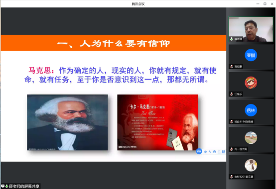 首先,薛建明教授强调信仰、信念、信心,任何时候都至关重要,并对同学们提出问题:人为什么要有信仰?随后指出信仰信念信心都是指引和支撑中国人民站起来、富起来、强起来的强大精神力量。之后,薛建明教授讲解周恩来信仰观的形成轨迹,以及周恩来言行一致且信仰坚定。最后,提出作为青年人要主动将自己的成长成才与实现“中国梦”紧密结合起来。