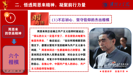 罗泽如老师主要围绕周恩来总理的伟大人生和崇高精神两方面来展开。他带领我们重温了周恩来一生,领略伟人风范,学深悟透周恩来精神,凝聚前行力量。