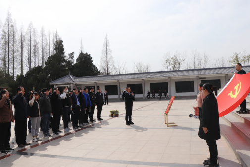 松柏苍翠,玉兰花开,烈士纪念碑巍然耸立。马从兵、杨权权代表公司向英勇的革命烈士敬献花篮,并缓步走向烈士纪念碑,仔细整理花篮缎带,在花篮前驻足凝视,向人民英雄深深三鞠躬。纪念碑广场上,在鲜红的党旗前,全体党员举起右手庄严宣誓,重温入党誓词。