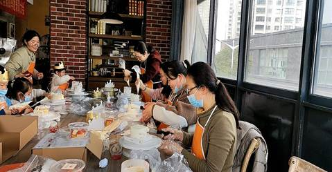 女教师在烘焙老师的专业指导下充分展示了厨艺。大家根据老师的示范,一步步码放蛋胚、涂抹奶油、添加辅料、最后裱花装饰。大家纷纷化身“烘焙达人”,品尝香醇丝滑的甜蜜,充分享受烘焙乐趣。