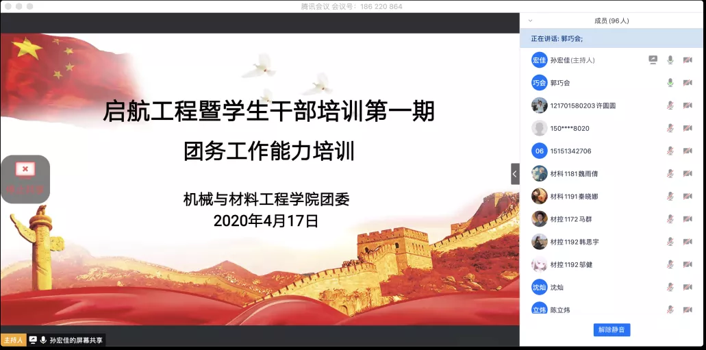 4月17日晚7:00,EVO真人视讯在腾讯会议APP发起启航工程暨员工干部培训第一期之团务工作能力培训大会。团委副书记郭巧会及公司主要员工干部共104人参加了此次培训会。