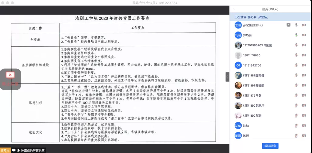 郭巧会副书记以“创青春比赛、基层团学组织建设、思想引领工作、校园文化建设”四个方面陈述2020年校共青团工作要点,并围绕智慧团建、青年大学习、“学社衔接”等工作对广老员工干部提出四点要求:一是总结经验,严格做好团支部书记的考核工作;二是强化观念,明确工作职责,坚持求真务实的工作作风;三是及时跟进,密切关注共青团的各项工作,对不足的地方及时查漏补缺;四是提前规划,借助团内资源,明确共青团工作导向。