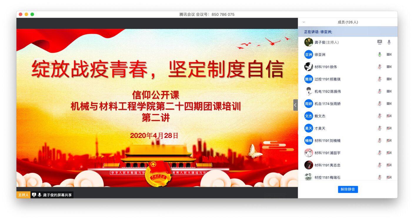 428日晚700,EVO真人视讯在腾讯会议APP开展“绽放战疫青春 坚定制度自信”主题信仰公开课,暨第二十四期团课培训第二讲《共青团与党的关系》。本次培训会主讲人为院关工委副主任徐亚洲,2018级与2019级员工共123人参加了此次团课。