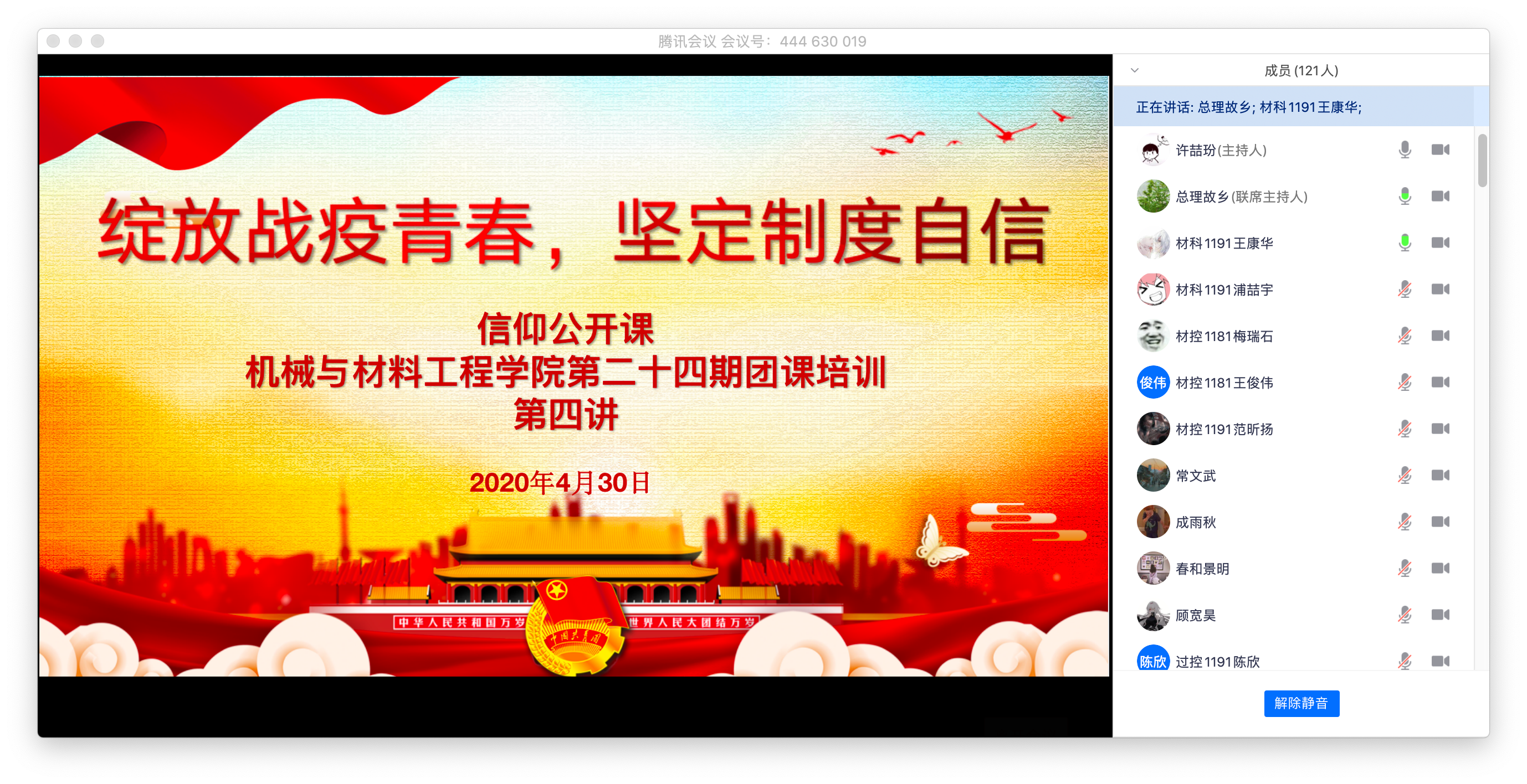 430日晚700,EVO真人视讯在腾讯会议APP开展“绽放战疫青春 坚定制度自信”主题信仰公开课,暨第二十四期团课培训第四讲《讲好中国故事 坚定中国自信》。本次培训会主讲人为2019级辅导员罗泽如老师,2018级与2019级员工共123人参加了此次团课。