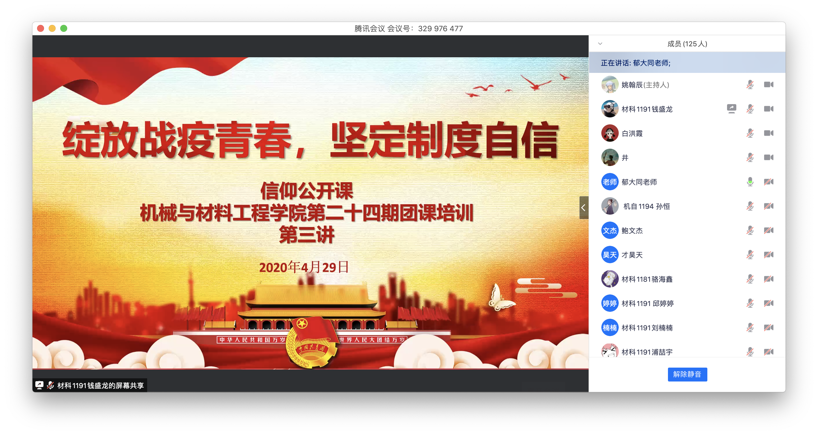 429日晚7:00,EVO真人视讯在腾讯会议APP开展“绽放战疫青春、坚持制度自信”主题信仰公开课,暨第二十四期团课培训第三讲《奋斗青春:就业篇》。本次培训会主讲人为学工办主任郁大同,2018级与2019级员工共123人参加了此次团课。