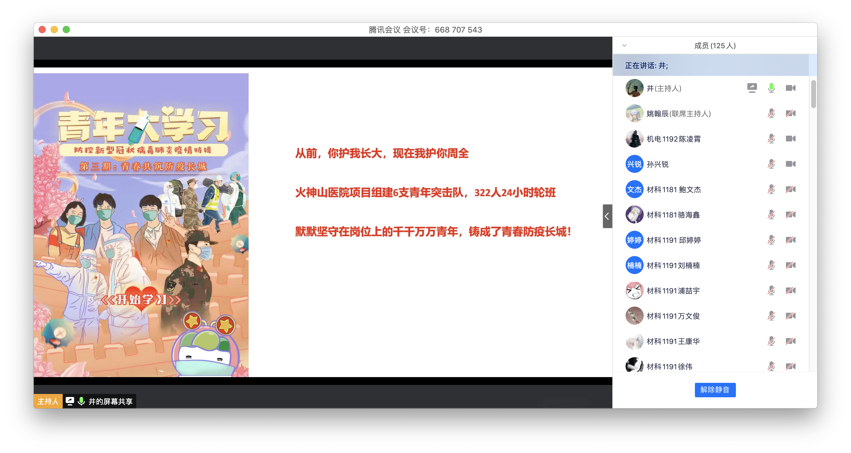 本次团课是一学一做专题,郭巧会副书记带领团员学习习近平总书记关于新冠肺炎疫情防控的系列重要讲话精神,生动讲述公司抗疫先锋徐磊、北大援鄂医疗队的青春抗疫故事,号召广大共青团员们不负青春、不负韶华,在为人民服务中茁壮成长,在艰苦奋斗中磨练意志品质,在实践中增长工作本领,让青春在党和人民需要的地方绽放绚丽之花。