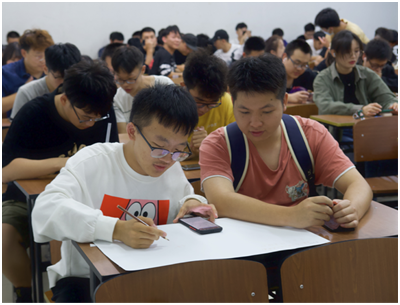 活动开始,同学们通过抽签自主分配到各个小组,通过自我介绍互动环节认识对方。接下来,每个小组同学用画笔绘就心中的淮工形象,从内心表达对淮工的认知和情感,用手中的笔写下一句句对淮工的纸短情长。经过半个小时的思考和创作后,每个小组代表走上讲台展示每个作品的内容和意义,台下同学们纷纷鼓掌称赞。