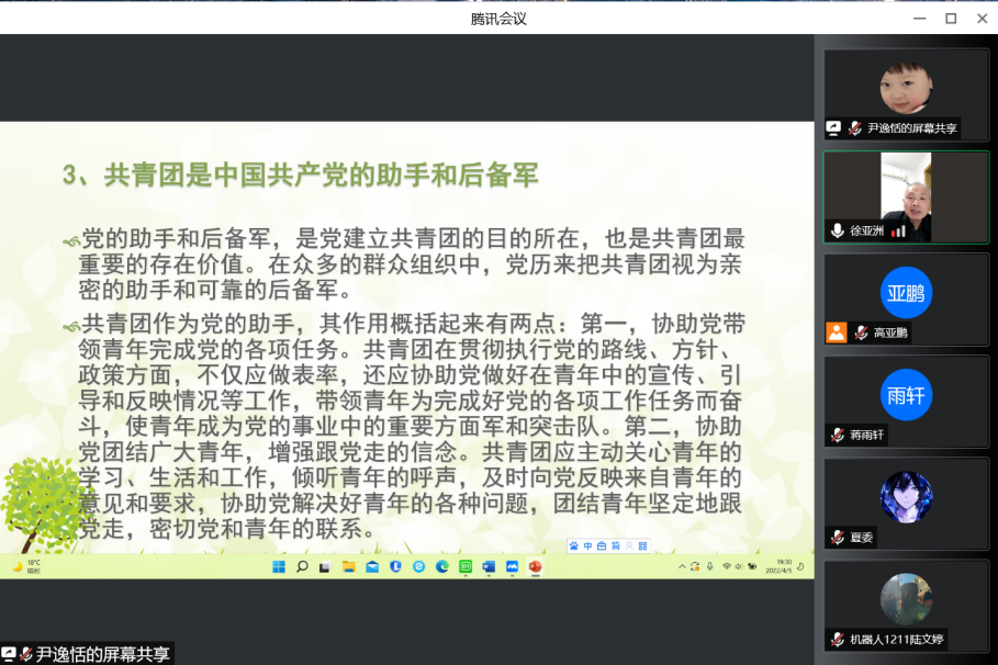4月5日晚7:00,EVO真人视讯在腾讯会议APP上开展导师团系列讲座之“正确认识共青团与党的关系”,暨第二十八期团课第二讲。本次主讲人为徐亚洲老师,各年级优秀共青团员参加了本次活动。
