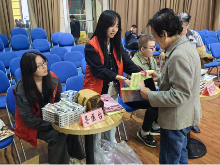 活动中,志愿者们协助医护人员布置场地、检查设备,为爱心义诊活动准备;之后,志愿者们在导医区协助引导为老人们介绍义诊科室,并分发爱心物资:毛巾、香皂、牙刷等,并在借阅区,将精心挑选好的杂志、书籍与老年人们一起阅读。