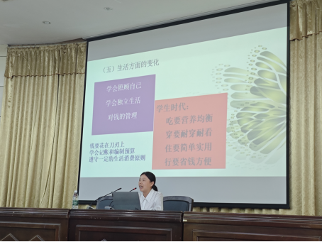 王明霞讲到,大学新生适应是一个复杂而多维的过程,它涵盖了学习方式的转变、人际关系的重建以及生活环境的适应等多个方面。她详细梳理了适应过程中一般要经历的重要环节、重要转变,她鼓励同学们要勇于面对这些转变,逐步确立新的发展目标,重新定位自身角色,以更加积极和主动的态度去拥抱老员工活。