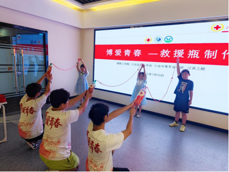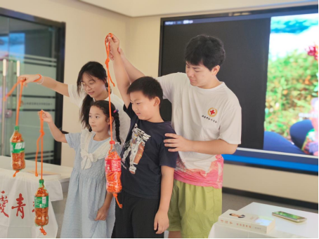 最令人期待的“变废为宝”环节,成了诠释“博爱青春”实践性的绝佳注脚。桌上堆满的空塑料瓶、浮力绳和剪刀,在志愿者的引导下有了新使命。“大家看,把瓶子灌满水,既能增加重量方便投掷,又能让落水者抓住浮力!”志愿者一边演示打结,一边讲解原理。孩子们立刻拉着家长行动起来:有的孩子踮着脚给瓶子灌水,家长在一旁帮忙扶稳;有的一家人分工合作,爸爸剪绳、妈妈系瓶、孩子负责检查是否牢固。当一个个原本要被丢弃的塑料瓶,被系成一串结实的“救援绳”时,孩子们举着成果欢呼:“这是我们的爱心救生圈!”此刻,“奉献”不再是抽象的词汇,而是亲子协作中传递的默契,是变废为宝里蕴含的智慧,更是博爱青春项目“让善意落地生根”的生动实践。