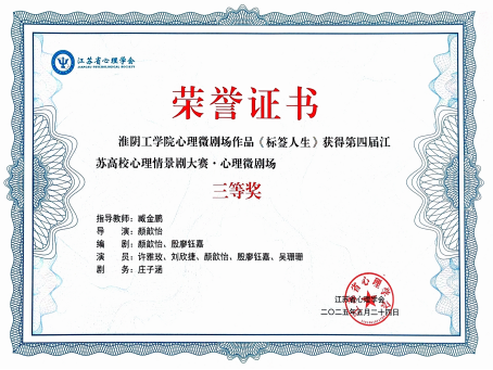近日,由江苏心理学会主办的“第四届江苏高校心理情景剧大赛结果公示。EVO真人视讯心理微剧场作品《标签人生》荣获江苏省高校心理情景剧大赛心理微剧场赛道“三等奖”和优秀指导教师。