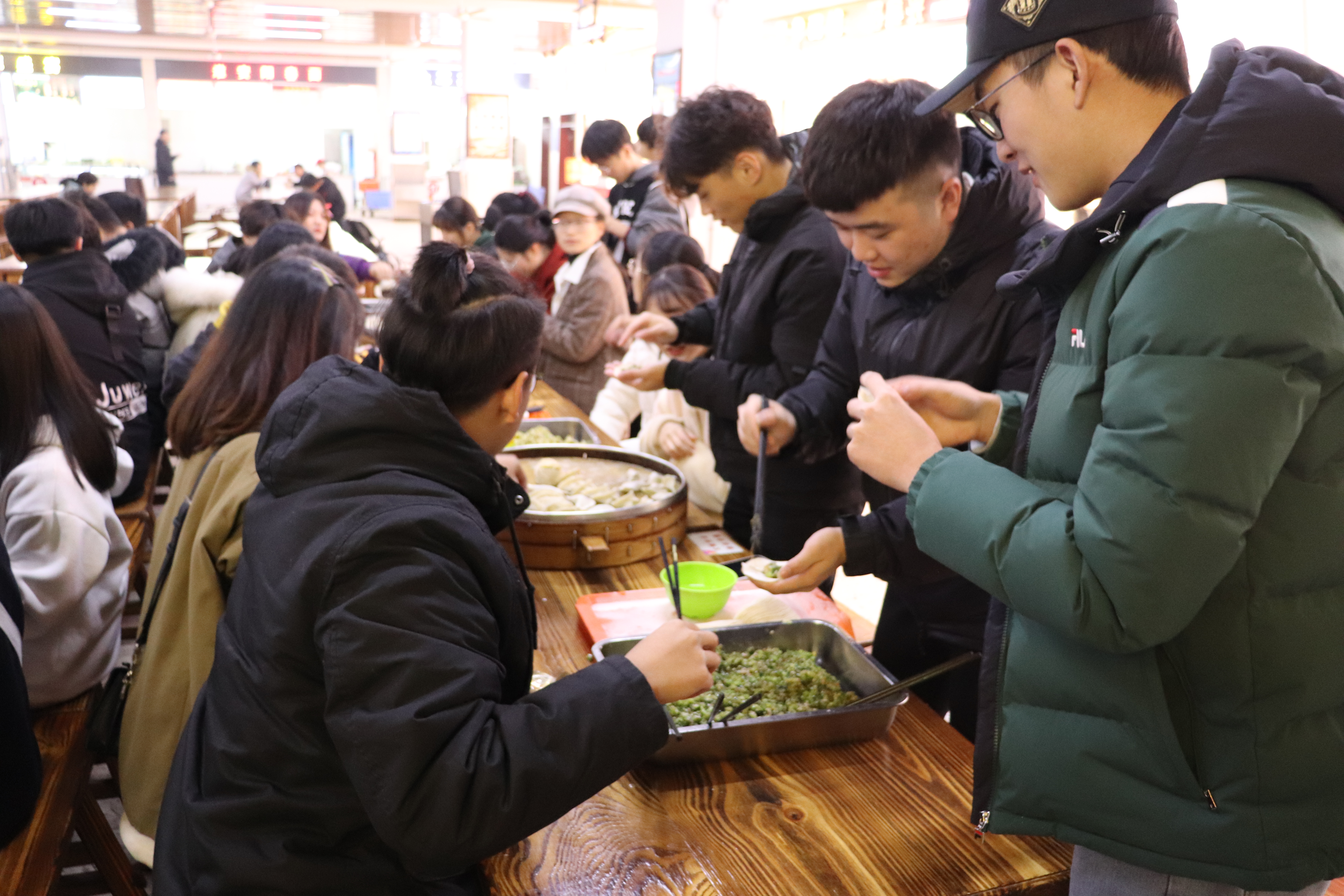 活动中,同学们以小组为单位领取馅料和工具,分工有序的进行和面、拌馅、擀面皮、包饺子。期间,同学们用独体的方式包着各式各样的饺子,一排排个性的饺子很快摆满了一个个盘子,现场气氛十分活跃,同学们脸上都洋溢着欢乐与喜悦。大四考研同学在考试结束后也一同品尝着学弟学妹精心做的水饺,深刻感受到暖冬行动给他们带来的温暖。