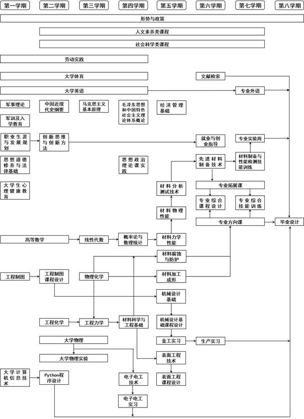 材料科学与工程基础、材料力学性能、材料分析测试技术、先进材料制备技术、材料物理性能、材料加工成形、表面工程技术、材料腐蚀与防护